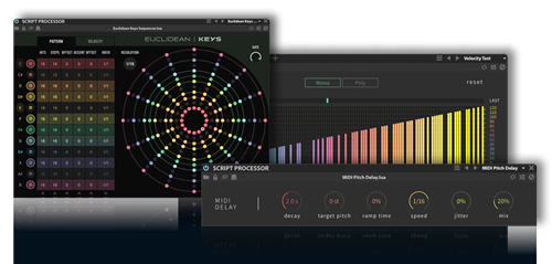 FalconのEventセクションは、合成処理の前段階におけるデーター、主にMIDIノートやMIDIデーターの操作、解析、生成ををスクリプトベースで制御するプロセッサーを扱います。これらのイベントプロセッサーは、受信したノートをアルペジエイトしたり、(発音タイミングを僅かに分散して)ギターのようの掻き鳴らすように演奏したり、マイクロチューニングの適用から、MIDIファイルの再生や自動生成的なシーケンスの作成まで、幅広い処理を実行できます。生成または処理されたMIDIデーターは、Falcon内部のあらゆる要素を制御するために使用できるほか、MIDI Outモジュールを介して外部ソフトウェアやハードウェアへルーティングすることも可能です。